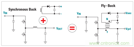圖1:Fly-Buck轉換器創(chuàng)建方式是在一個同步降壓轉換器內添加耦合繞組。