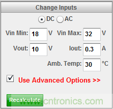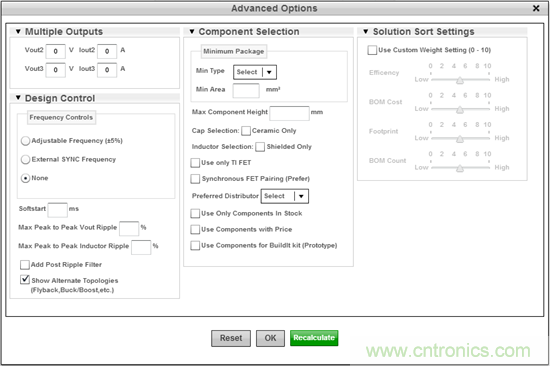 單擊“Use Advanced Options”(使用高級選項)來打開Advanced Options菜單(圖3)。在Design Control(設計控制)項下,確保“Show Alternate Topologies”(顯示替代拓撲)復選框被選中,這樣將列出所有可能的Fly-Buck解決方案。在你確認復選框的選擇后,單擊“Recalculate”(重新計算)按鈕來繼續(xù)。