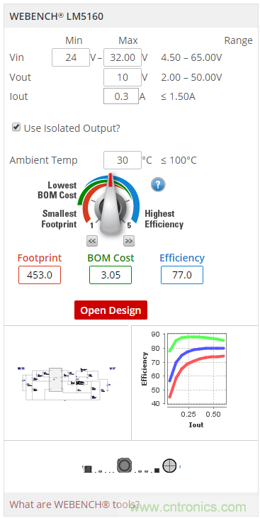 在使用這個WEBENCH控制面板時,輸入針對你的Fly-Buck設計的輸入要求。在打開這個設計之前,確保“Use Isolated Output?”(使用隔離輸出嗎?)復選框被選中。這樣就確保了這個在WEBENCH電源設計工具中創(chuàng)建的設計使用Fly-Buck拓撲,而不是普通的降壓拓撲。