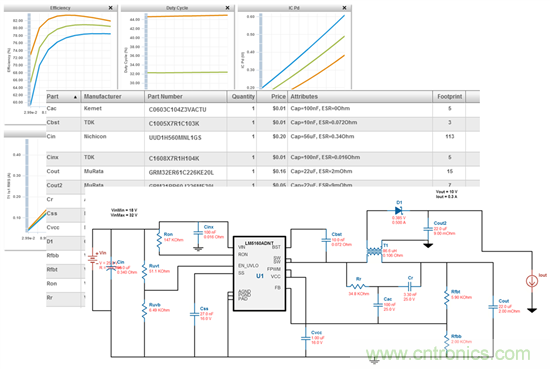 圖5:WEBENCH工具提供針對你Fly-Buck設計的一個功率耗散值列表,一個完整的BOM和一個電路原理圖。