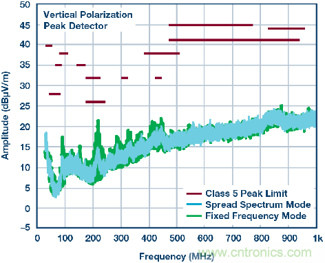在整個負載范圍內(nèi),LT8645S可以輕松符合汽車CISPR25、Class 5峰值EMI限制。還可以使用擴頻頻率調(diào)制進一步降低EMI水平(圖2)。LT8645S內(nèi)置高效率頂部和底部功率開關(guān),并將必要的升壓二極管、振蕩器以及控制和邏輯電路集成到單個芯片中。低紋波突發(fā)工作模式可在低輸出電流下保持高效率,同時使輸出紋波低于10 mV p-p。最后,LT8645S采用小尺寸散熱增強型4 mm×6 mm、32引腳LQFN封裝。