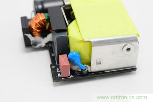 保險(xiǎn)旁是藍(lán)色的Y電容,腳上套有磁環(huán)。