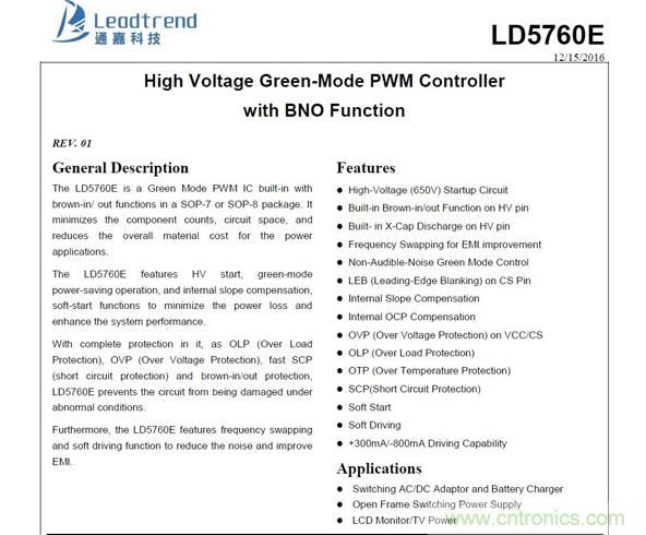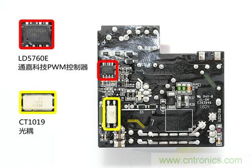 由于沒(méi)有使用SR技術(shù),PCB背面元器件較少,主要是位于左上的 LD5760E,來(lái)自通嘉科技的PWM控制器,與前述的東芝TK10A60W組成一次側(cè)電路。左下方的白色器件為CT1019光耦,用于電壓反饋。