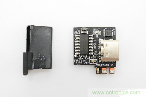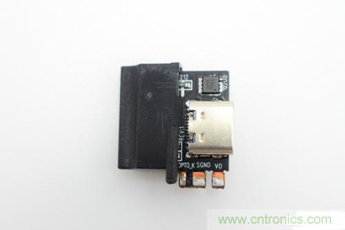 Type-C輸出為獨(dú)立的一塊PCB小板,小板尾部有塑膠封套,用于絕緣和定位。