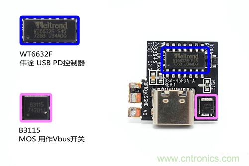 14腳IC為 Weltrend偉詮WT6632F ,來(lái)自偉詮的 USB PD控制器,同時(shí)支持QC2.0和QC3.0協(xié)議。粉色框內(nèi)是絲印為 B3115 的貼片MOSFET,用于Vbus開(kāi)關(guān)。