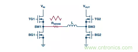 圖9電路解決了這個(gè)問(wèn)題,其將檢測(cè)電阻與電感串聯(lián),從而在降壓和升壓模式下均能連續(xù)測(cè)量電感電流信號(hào)。由于電流檢測(cè) RSENSE連接到具有高開(kāi)關(guān)噪聲的SW1節(jié)點(diǎn),因此需要精心設(shè)計(jì)控制器IC,使內(nèi)部電流比較器有足夠長(zhǎng)的消隱時(shí)間。