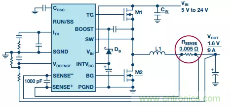 使用RSENSE和DCR兩種檢測(cè)方法時(shí),由于檢測(cè)信號(hào)較小,故均需要開(kāi)爾文檢測(cè)。必須讓開(kāi)爾文檢測(cè)痕跡(圖5中的SENSE+和 SENSE-)遠(yuǎn)離高噪聲覆銅區(qū)和其他信號(hào)痕跡,以將噪聲提取降至最低,這點(diǎn)很重要。某些器件(如LTC3855)具有溫度補(bǔ)償DCR檢測(cè)功能,可提高整個(gè)溫度范圍內(nèi)的精度。