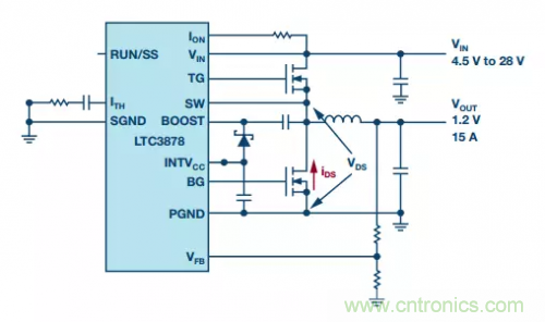 利用MOSFET RDS(ON)進(jìn)行電流檢測(cè),可以實(shí)現(xiàn)簡(jiǎn)單且經(jīng)濟(jì)高效的電流檢測(cè)。LTC3878是一款采用這種方法的器件。它使用恒定導(dǎo)通時(shí)間谷值模式電流檢測(cè)架構(gòu)。頂部開(kāi)關(guān)導(dǎo)通固定的時(shí)間,此后底部開(kāi)關(guān)導(dǎo)通,其RDS壓降用于檢測(cè)電流谷值或電流下限。