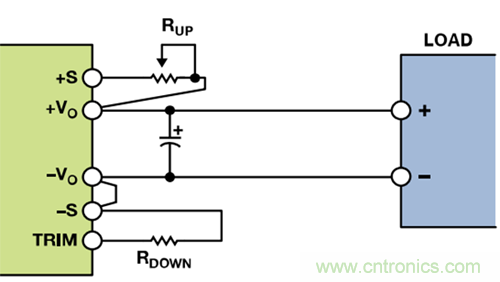 輸出電壓可通過改變連接電源模塊正輸出端或接地端的電阻來進行調(diào)節(jié)。通過連接外部電阻RUP并使RDOWN浮空,可以向上調(diào)整輸出電壓(高于標稱輸出電壓),或者通過連接外部電阻RDOWN并使RUP短路(電阻值為零)向下調(diào)整(低于標稱輸出電壓)。