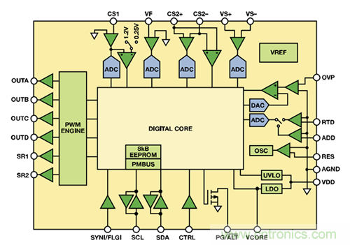 對于數(shù)字控制器來說,所有的控制功能均由數(shù)字邏輯實現(xiàn)。圖3所示為集成PMBus接口的高級數(shù)字控制器ADP1051的功能框圖。該器件非常適合高密度DC-DC電源轉(zhuǎn)換,具有6個可編程脈沖寬度調(diào)制 (PWM) 輸出,可控制大部分高效電源拓撲。另外,該器件還能控制同步整流 (SR),并集成6個模數(shù)轉(zhuǎn)換器 (ADC),能夠采樣模擬輸入電壓、輸入電流、輸出電壓、輸出電流、溫度以及其它參數(shù)。轉(zhuǎn)換為數(shù)據(jù)后,將這些信號發(fā)送至數(shù)字內(nèi)核模塊進行處理。該器件采用靈活的狀態(tài)機架構(gòu),以硬件實現(xiàn)全部功能,提供穩(wěn)定可靠的解決方案,但無法通過編程實現(xiàn)設計以外的功能。器件的全部功能—包括輸出電壓調(diào)整—均以數(shù)字方式處理。為了調(diào)整輸出電壓,應通過PMBus接口發(fā)送一條命令,改變數(shù)字基準電壓值。