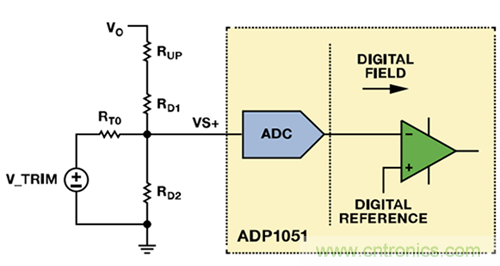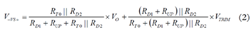 VS+引腳上的正常工作電壓為1 V。若VTRIM為1 V左右且RT0遠大于RD2,則可忽略電路的其余分支部分。復合網(wǎng)絡用作簡單分壓器,并調(diào)節(jié)RUP電阻值,提供類似于模擬控制器的特性,實現(xiàn)了模擬電源模塊中的電壓向上調(diào)整。