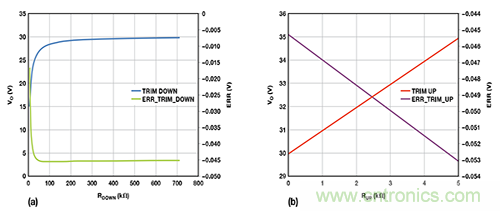 圖6. 使用重新配置的反饋網(wǎng)絡后,調(diào)整ADP1051輸出電壓的計算結(jié)果:(a) 向下調(diào)整 (b) 向上調(diào)整