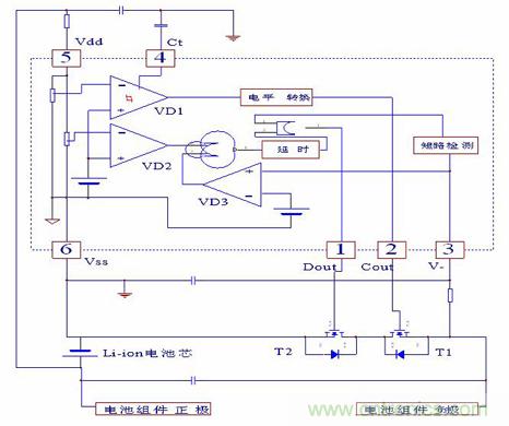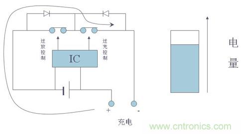 在帶有保護(hù)電路的電池中,當(dāng)控制IC檢測(cè)到電池電壓達(dá)到4.28V(該值由控制IC決定,不同的IC有不同的值)時(shí),其“CO”腳將由高電壓轉(zhuǎn)變?yōu)榱汶妷?,使T1由導(dǎo)通轉(zhuǎn)為關(guān)斷,從而切斷了充電回路,使充電器無(wú)法再對(duì)電池進(jìn)行充電,起到過(guò)充電保護(hù)作用。而此時(shí)由于T1自帶的體二極管VD1的存在,電池可以通過(guò)該二極管對(duì)外部負(fù)載進(jìn)行放電。
