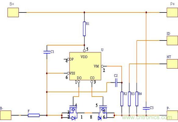 在正常狀態(tài)下電路中N1的“CO”與“DO”腳都輸出高電壓,兩個(gè)MOSFET都處于導(dǎo)通狀態(tài),電池可以自由地進(jìn)行充電和放電,由于MOSFET的導(dǎo)通阻抗很小,通常小于30毫歐,因此其導(dǎo)通電阻對(duì)電路的性能影響很小。