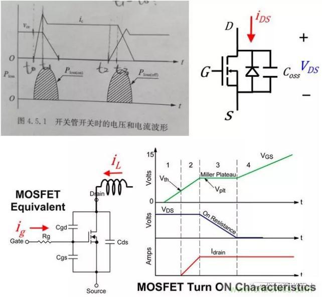 這里就用MOSFET代替BJT了,所以ids = ic,Vds=Vce,Coss也就是Cds代表輸出電容。簡(jiǎn)單來說就是當(dāng)MOS管一開始導(dǎo)通時(shí)輸出電容Coss還保持Vds電壓,隨著Ids電流越來越大,Vds電壓終于保持不住,開始下降。直到管子完全開啟。比較詳細(xì)的開啟過程是由Miller Plateau造成的,這里借用了網(wǎng)上一些解釋Miller Plateau的圖,如果有不清楚的就請(qǐng)見諒了。