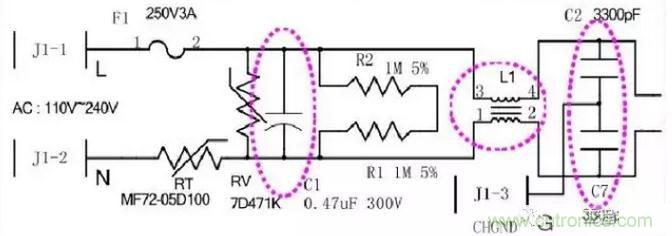 1、交流電源輸入分為3個端子:火線(L)/零線(N)/地線(G)。在火線和地線之間以及在零線和地線之間并接的電容, 這兩個Y電容連接的位置比較關(guān)鍵,必須需要符合相關(guān)安全標準, 以防引起電子設(shè)備漏電或機殼帶電,容易危及人身安全及生命。它們都屬于安全電容,從而要求電容值不能偏大,而耐壓必須較高。