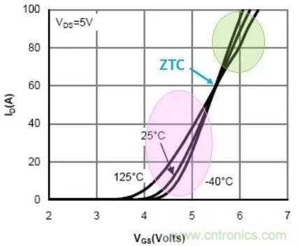功率MOSFET的轉(zhuǎn)移特性如圖1所示,VGS與電流ID曲線有一個溫度系數(shù)為0的電壓值5.5V,通常這個點(diǎn)就稱為零溫度系數(shù)點(diǎn)ZTC(Zero Temperature Coefficient)。VGS高于5.5V時,溫度越高電流越小,功率MOSFET的RDS是正溫度系數(shù);VGS低于5.5V時,溫度越高電流越大,功率MOSFET的的RDS是負(fù)溫度系數(shù)。