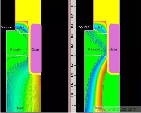 從電勢分布圖,功率MOSFET完全導(dǎo)通時,VDS的壓降低,耗盡層完全消失;功率MOSFET在線性區(qū)工作時,VDS的電壓比較高,耗盡層仍然存在,此時由于在EPI耗盡層產(chǎn)生電子-空穴對,空穴也會產(chǎn)生電流,參入電流的導(dǎo)通。