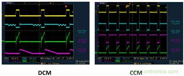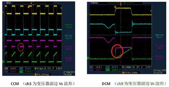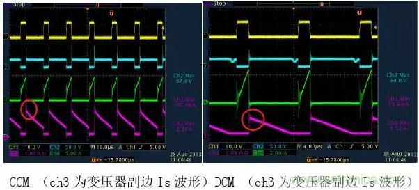 1)變壓器初級(jí)電流,CCM模式是梯形波,而DCM模式是三角波。