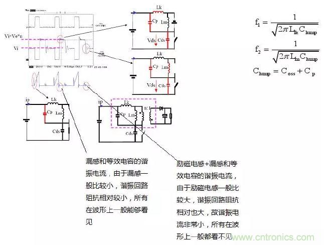 f1比f(wàn)2大很多(從波形上可以看出),這是由于漏感一般相對(duì)較小;同時(shí)由于f1所在回路阻抗比較小,諧振電流較大,所以能夠很快消耗在等效電阻上,這也就是為什么f1所在回路很快就諧振結(jié)束的原因?。ň唧w諧振時(shí)間可以通過(guò)等效模型求解:二次微分方程估算)