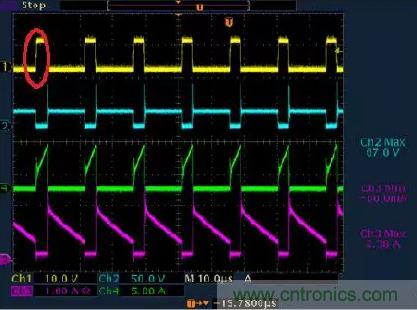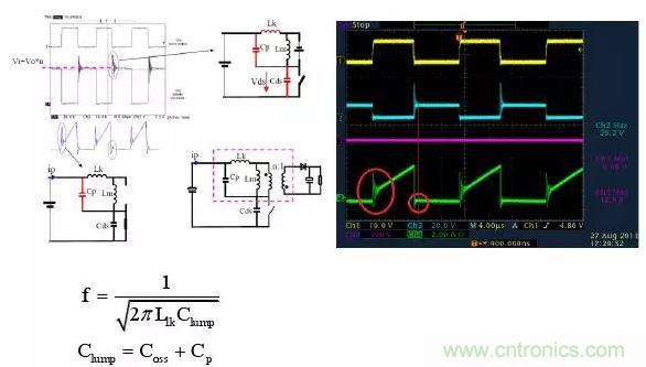 不管是在CCM模式還是DCM模式,在mosfet關(guān)斷off時(shí)刻,變壓器副邊電流IS波形都有一些震蕩。主要原因是次級(jí)電感+肖特基接電容+輸出電容之間的諧振造成的。