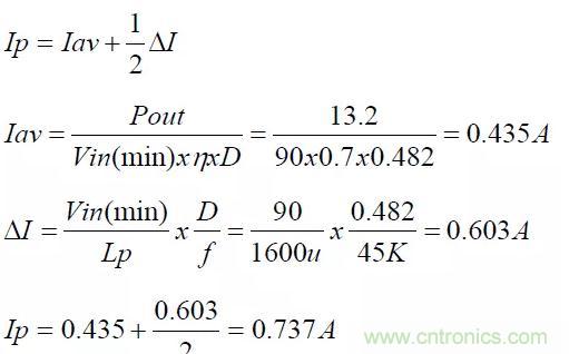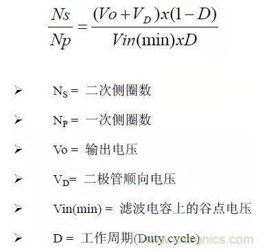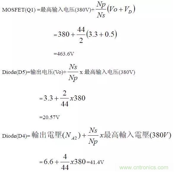 依據(jù)變壓器的圈比關(guān)系,可以初步計(jì)算出變壓器的應(yīng)力(Stress)是否符合選用零件的規(guī)格,計(jì)算時(shí)以輸入電壓264V(電容器上為380V)為基準(zhǔn)。