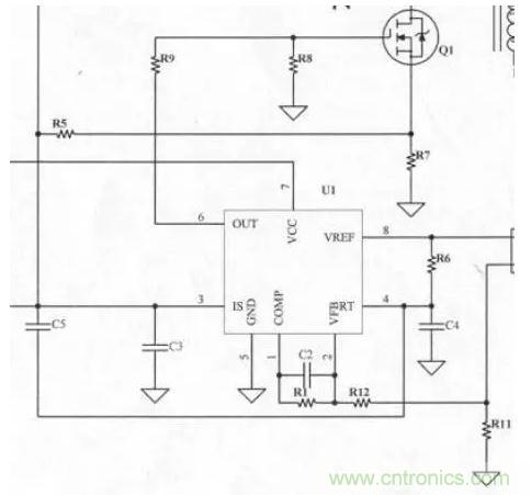 3843內(nèi)部有一個(gè)Error AMP(誤差放大器),R1、R11、R12、C2及Error AMP組成一個(gè)負(fù)回授電路,用來(lái)調(diào)整回路增益的穩(wěn)定度,回路增益,調(diào)整不恰當(dāng)可能會(huì)造成振蕩或輸出電壓不正確,一般C2使用立式積層電容(溫度持性較好)。