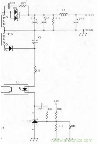 因?yàn)檩敵鲭妷簽?.3V,而輸出電壓調(diào)整器(Output Voltage Regulator)使用TL431(Vref=2.5V)而非TL432(Vref=1.25V),所以必須多增加一組繞組提供Photo coupler及TL431所需的電源,因?yàn)閁2及U3所需的電流不大(約10mA左右),二極管耐壓值100V即可,所以只需使用1N4148(0.15A/100V)。