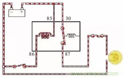 如下圖所示,85#和86#端子是線圈,屬于控制部分;87#和30#端子是觸點,屬于被控制部分(即輸出端)。