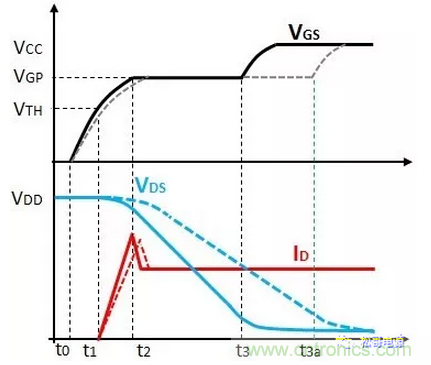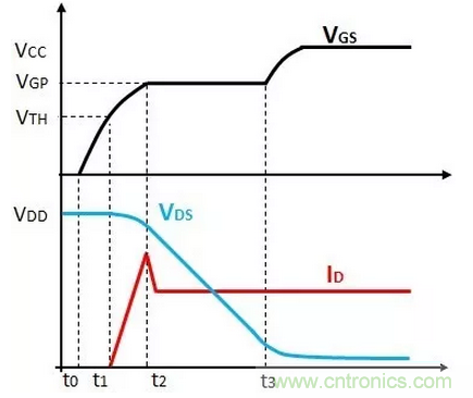 階段3(t2-t3)為米勒平臺(tái),VGS電壓保持米勒平臺(tái)電壓VGP,整個(gè)過程中,VDS電壓逐漸下降到低的電壓值,ID電流保持不變。