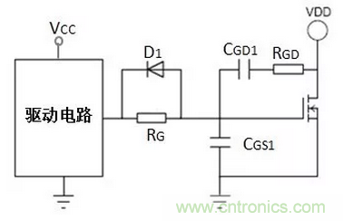 完整的外圍電路,包括G極電阻總和RG,RG并聯(lián)快關(guān)斷二極管D1,功率MOSFET的G、S外加電容CGS1,G、D外加電容CGD1和電阻RGD,如圖7所示,其中RG為G極電阻總和,包括功率MOSFET內(nèi)部電阻、驅(qū)動(dòng)芯片上拉電阻和外加串聯(lián)電阻RG1。