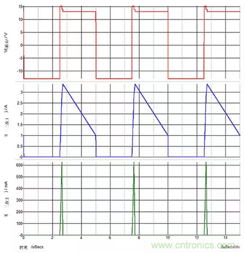 圖3:重載次級(jí)1和輕載次級(jí)2。基座電壓對(duì)次級(jí)2的輸出電容器進(jìn)行峰值充電。
