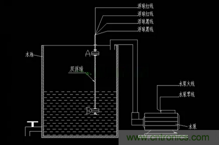 2、當水位漲到A、B處限位開關(guān)之間時,B處開關(guān)斷開,A處開關(guān)仍然是閉合狀態(tài),此時線圈被自鎖得電,水泵繼續(xù)運行;