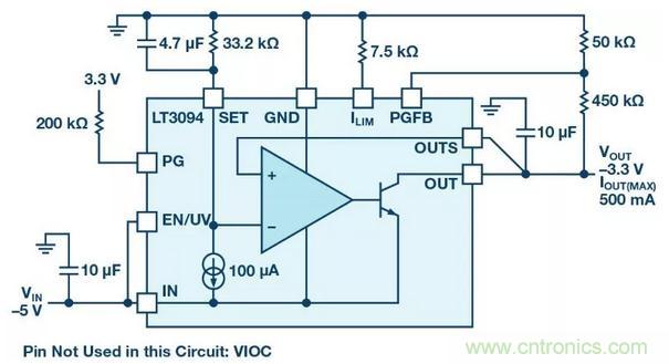 LT3094采用小尺寸、低成本的10μF陶瓷輸出電容工作,可優(yōu)化穩(wěn)定性和瞬態(tài)響應(yīng)。利用單個電阻器可編程外部精密電流限值(±10%過溫)。該器件的VIOC引腳可控制前端穩(wěn)壓器,以最大限度地降低功耗并優(yōu)化PSRR。單個SET引腳電容可降低輸出噪聲,并提供基準軟啟動功能,防止輸出電壓在開啟時過沖。此外,該器件的內(nèi)部保護電路還包括具有折返功能的內(nèi)部限流和帶遲滯的熱過載。其他功能包括快速啟動功能(如果使用的SET引腳電容值較大,則非常有用)和電源良好標志(業(yè)界首款具有此功能的負輸出LDO穩(wěn)壓器),具有可編程閾值,用于指示輸出電壓調(diào)節(jié)。