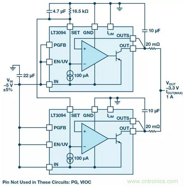 并聯(lián)多個LT3094可獲得更高的輸出電流。將所有SET引腳和所有IN引腳并在一起。使用小尺寸的PCB走線(用作鎮(zhèn)流電阻)將OUT引腳連接在一起,以均衡LT3094中的電流。也可以將兩個以上的LT3094進行并聯(lián),實現(xiàn)更高的輸出電流和更低的輸出噪聲。輸出噪聲的降低與并聯(lián)器件數(shù)的平方根成比例。并聯(lián)多個LT3094對于在PCB上散熱也很有用。對于具有高輸入至輸出電壓差的應(yīng)用,也可以使用一個輸入串聯(lián)電阻或與LT3094并聯(lián)的電阻進行散熱。圖4所示為并聯(lián)電路實現(xiàn)方案。