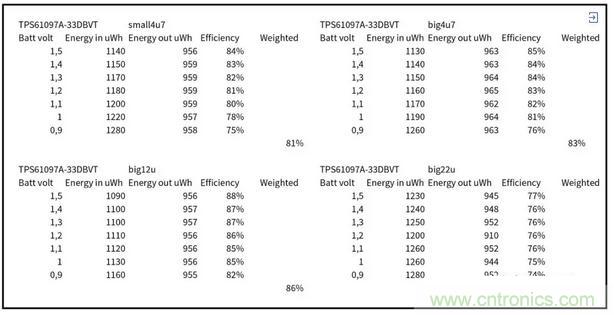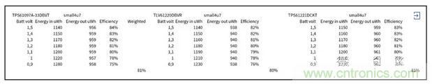 Otii工具讓效率計(jì)算變得非常簡單,只需將輸出能量除以輸入能量即可,然后根據(jù)案例一測量設(shè)置中的說明對(duì)該效率值進(jìn)行加權(quán)。圖5為所有三個(gè)DC/DC轉(zhuǎn)換器提供了一個(gè)概覽。