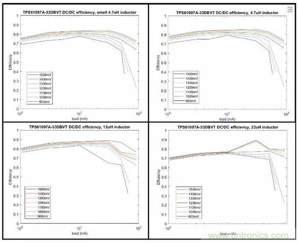 使用小型4.7μH片式電感器時(shí),三個(gè)DC/DC轉(zhuǎn)換器的性能幾乎相同。為了繼續(xù)研究DC/DC,使用不同的電感器來了解效率是否有所提高。測試中選擇了三種不同的Bourns電感器和一種Murata電感器。