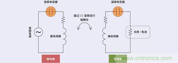 磁共振式是在輸電側(cè)與受電側(cè)分別插入電容器,形成LC諧振電路,并使輸電側(cè)與受電側(cè)諧振頻率一致,從而進(jìn)行電力傳輸?shù)姆绞?。其特點(diǎn)在于即使線圈間的距離多少會(huì)出現(xiàn)擴(kuò)大,或偏離中心位置的情況等在耦合系數(shù)較低的狀態(tài)下也能實(shí)現(xiàn)高傳輸效率。其基本原理如圖1所示。