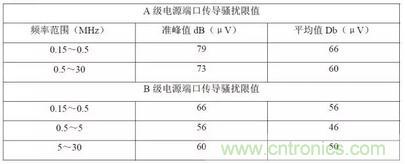 開關(guān)電源的傳導(dǎo)騷擾是通過電源的輸入電源線向外傳播的電磁干擾。在開關(guān)電源輸入電源線中向外傳播的騷擾,既有差模騷擾、又有共模騷擾,共模騷擾比差模騷擾產(chǎn)生更強(qiáng)的輻射騷擾。傳導(dǎo)騷擾的測試頻率范圍為150KHz~30MHz,限值要求如下表1 所示: