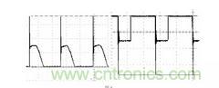 圖7 中,TI 是變壓器,VD1、VD2 分別是整流管和續(xù)流管,由于整流管、續(xù)流管在由導(dǎo)通轉(zhuǎn)向截止時有反向恢復(fù)電流,該反向恢復(fù)電流在VD1、VD2 兩端產(chǎn)生比較高的電壓峰值,由于快恢復(fù)二極管的反向恢復(fù)電流在幾十nS,所以峰值電壓的頻率較高,其基波頻率在幾十MHz,由于頻率很高,輻射能力很強(qiáng),下圖8 是整流管和續(xù)流管的電壓波形。