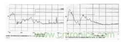 下面圖 9 是采取在PFC 開關(guān)管散熱器對PFC 輸出地加電容與不加電容輻射強(qiáng)度的對比。