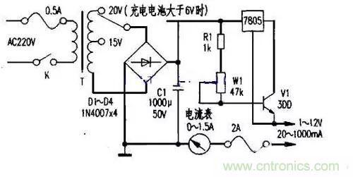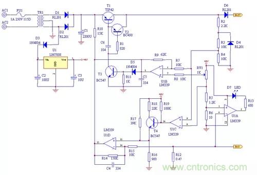 本電路設(shè)有反極性保護電路,由D4,U,U1D,T1及外圍元件構(gòu)成,當(dāng)電池反接時,充電器限制輸出電流不致發(fā)生事故。充電指示由U,D7及外圍元件構(gòu)成,充電時,D7點亮,充電器進入浮充狀態(tài)后,D7熄滅,表示充電結(jié)束。