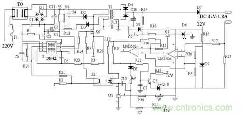 LM358(雙運算放大器,1腳為電源地,8腳為電源正)及其外圍電路提供12V工作電源D9為LM358提供基準電壓,經(jīng)R26,R4分壓達到LM358的第二腳和第5腳正常充電時,R27上端有0.15-0.18V左右電壓,此電壓經(jīng)R17加到LM358第三腳,從1腳送出高電壓當(dāng)電池電壓上升到44.2V左右時,充電器進入恒壓充電階段,輸出電壓維持在44.2V左右,充電器進入恒壓充電階段,電流逐漸減小當(dāng)充電電流減小到200mA-300mA時,R27上端的電壓下降,LM358的3腳電壓低于2腳,1腳輸出低電壓,Q2關(guān)斷,D6熄滅同時7腳輸出高電壓,此電壓一路使Q3導(dǎo)通,D10點亮另一路經(jīng)D8,W1到達反饋電路,使電壓降低充電器進入涓流充電階段1-2小時后充電結(jié)束。
