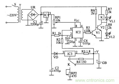 電源電路由電源開關(guān)S、電源變壓器T、整流橋堆UR、濾波電容C1、C2和三端集成穩(wěn)壓集成電路IC1組成;充電電路由二極管VD、三端可調(diào)穩(wěn)壓集成電路IC3、電阻R2~R4、電位器RP2和繼電器K的控制觸頭等組成;控制電路由時基集成電路IC2、電位器RP1、電阻R1、R5~R8、電容C3、C4、晶體管V1、V2、繼電器K和發(fā)光二極管VL1、VL2組成。