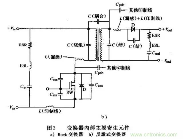 在所有開(kāi)關(guān)電源中,有一些常見(jiàn)的寄生參數(shù),在觀察變換器內(nèi)主要交流節(jié)點(diǎn)的波形時(shí),可以明顯看到它們的影響。有些器件的數(shù)據(jù)資料中,甚至給出了這些參數(shù),如MOSFET的寄生電容。兩種常見(jiàn)變換器的主要寄生參數(shù)見(jiàn)圖3。