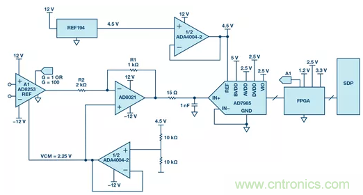 圖1中的電路顯示了帶有2.5MSPS和上游可編程儀表放大器的16位SAR轉(zhuǎn)換器,它將增益設(shè)置為1或100。通過在FPGA中進(jìn)行過采樣和數(shù)字信號處理,該電路可實(shí)現(xiàn)大于125dB的動(dòng)態(tài)范圍,并且仍然非常安靜。高動(dòng)態(tài)范圍是通過AD8253的自動(dòng)切換和過采樣實(shí)現(xiàn)的,其中信號的采樣速率遠(yuǎn)高于奈奎斯特頻率。