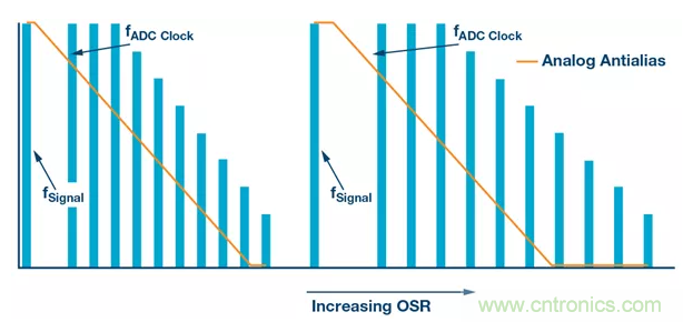根據(jù)經(jīng)驗(yàn),采樣頻率加倍可在原始信號帶寬下將信噪比(SNR)提高約3dB。在圖1所示的電路中,仍然在FPGA中應(yīng)用數(shù)字濾波,以消除高于目標(biāo)信號帶寬的噪聲。原理如圖2所示。