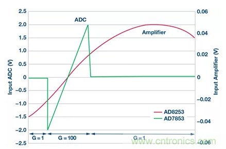 除模擬路徑中的組件外,F(xiàn)PGA(或處理器)對電路性能也很重要。關(guān)鍵任務(wù)是將儀表放大器的增益從1切換為100。為此,對許多閾值進(jìn)行了編程以確保ADC不飽和。因此,AD8253在輸入電壓高達(dá)20mV左右時(shí)以100為增益運(yùn)行,這使得ADC輸入端的最大電壓達(dá)2.0V。然后,F(xiàn)PGA將AD8253的增益降至1且沒有延遲,以防止過載(見圖3)。