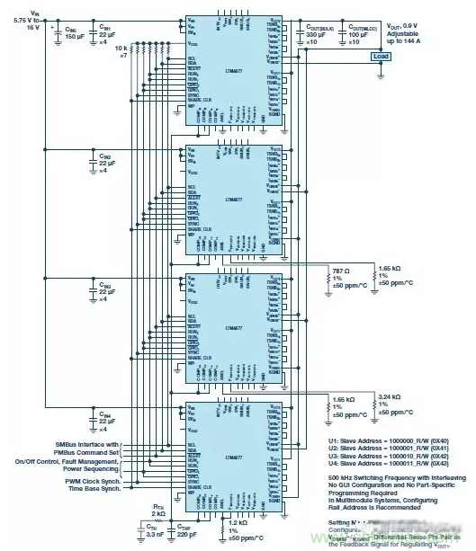 圖7:利用四個LTM4677模塊并聯(lián)的應(yīng)用電路圖,可提供高達(dá)144A的電流