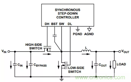 圖1所示為一個(gè)同步降壓調(diào)節(jié)器設(shè)計(jì),它包括一個(gè)開(kāi)關(guān)控制器和以下外部電源器件:高端開(kāi)關(guān)、低端開(kāi)關(guān)、電感、輸入電容、輸出電容和旁路電容。圖1中的箭頭表示高開(kāi)關(guān)電流流向。必須小心放置這些電源器件,避免產(chǎn)生不良的寄生電容和電感,導(dǎo)致過(guò)大噪聲、過(guò)沖、響鈴振蕩和接地反彈。